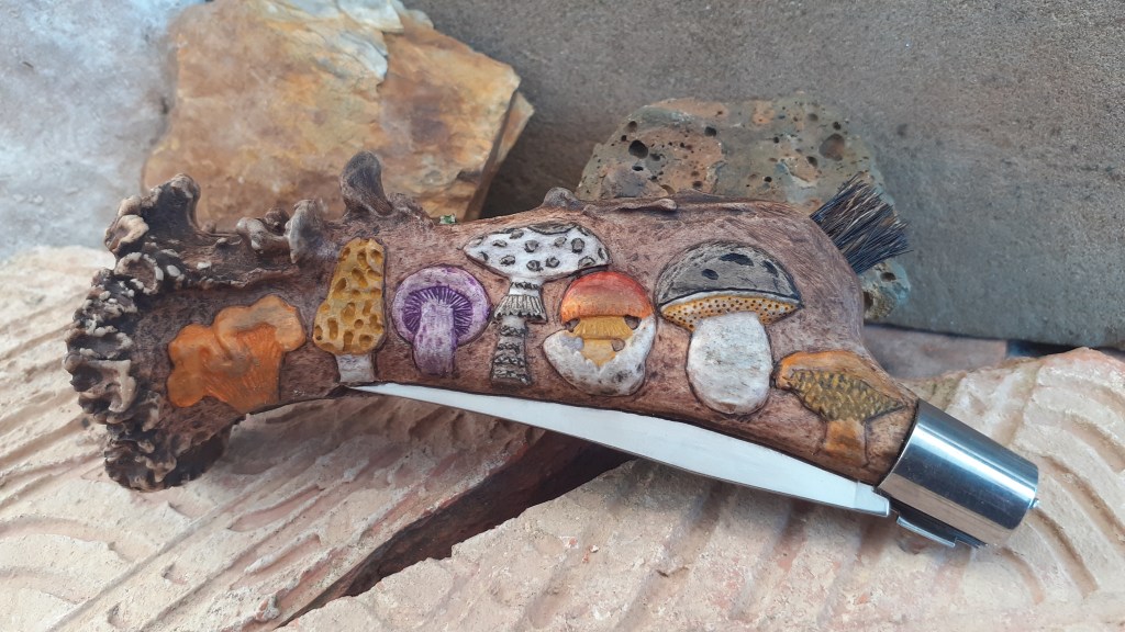 Navajas talladas en hueso, personalizadas con motivos micológicos y de naturaleza. Elaboradas a mano, en cuerna de corzo y ciervo, con filo de acero inoxidable. Productos de artesanía para regalos personalizados