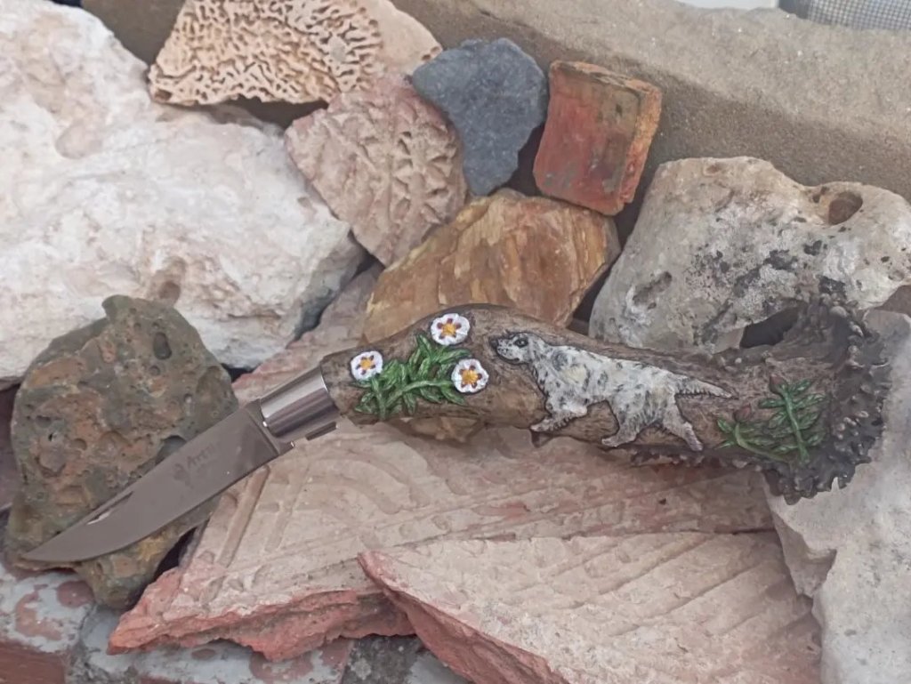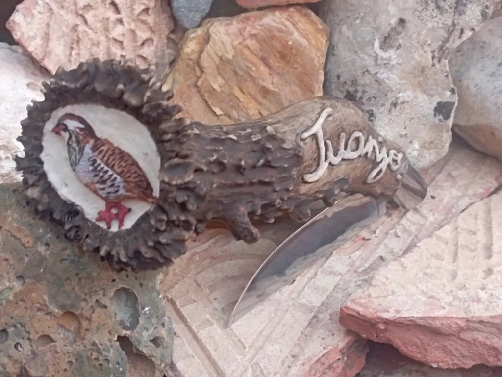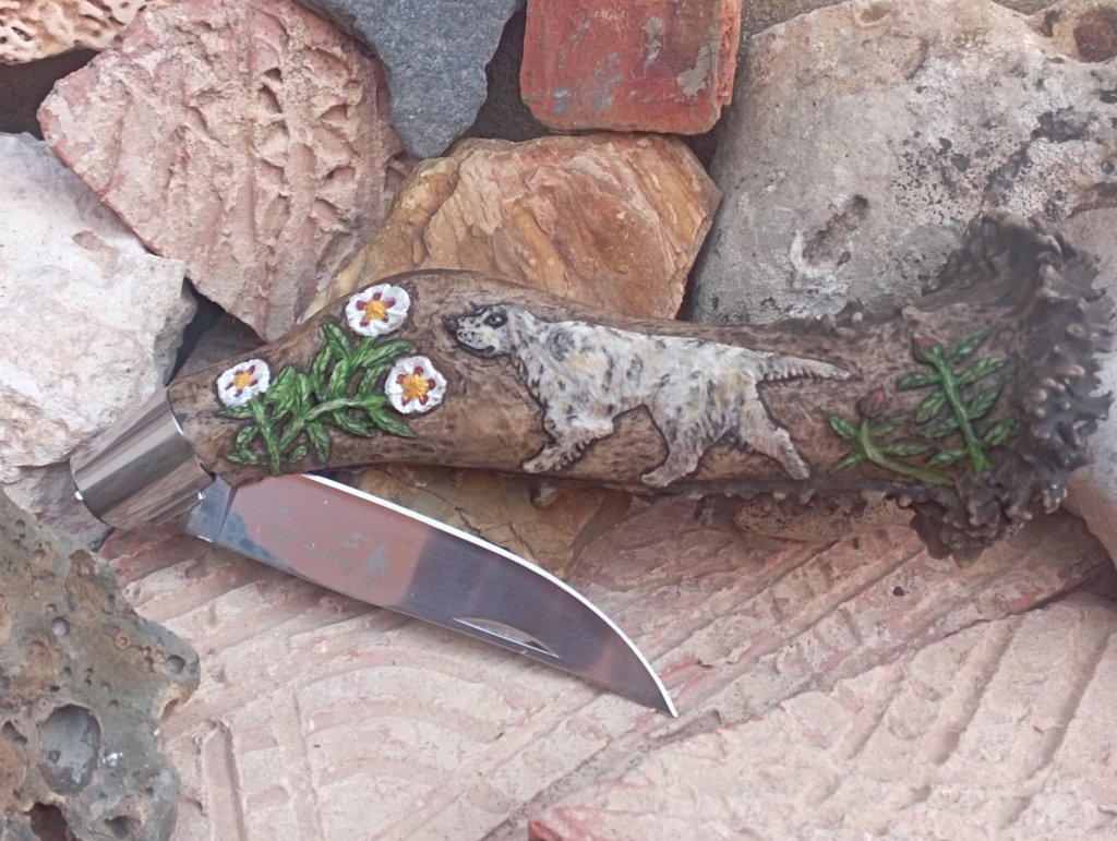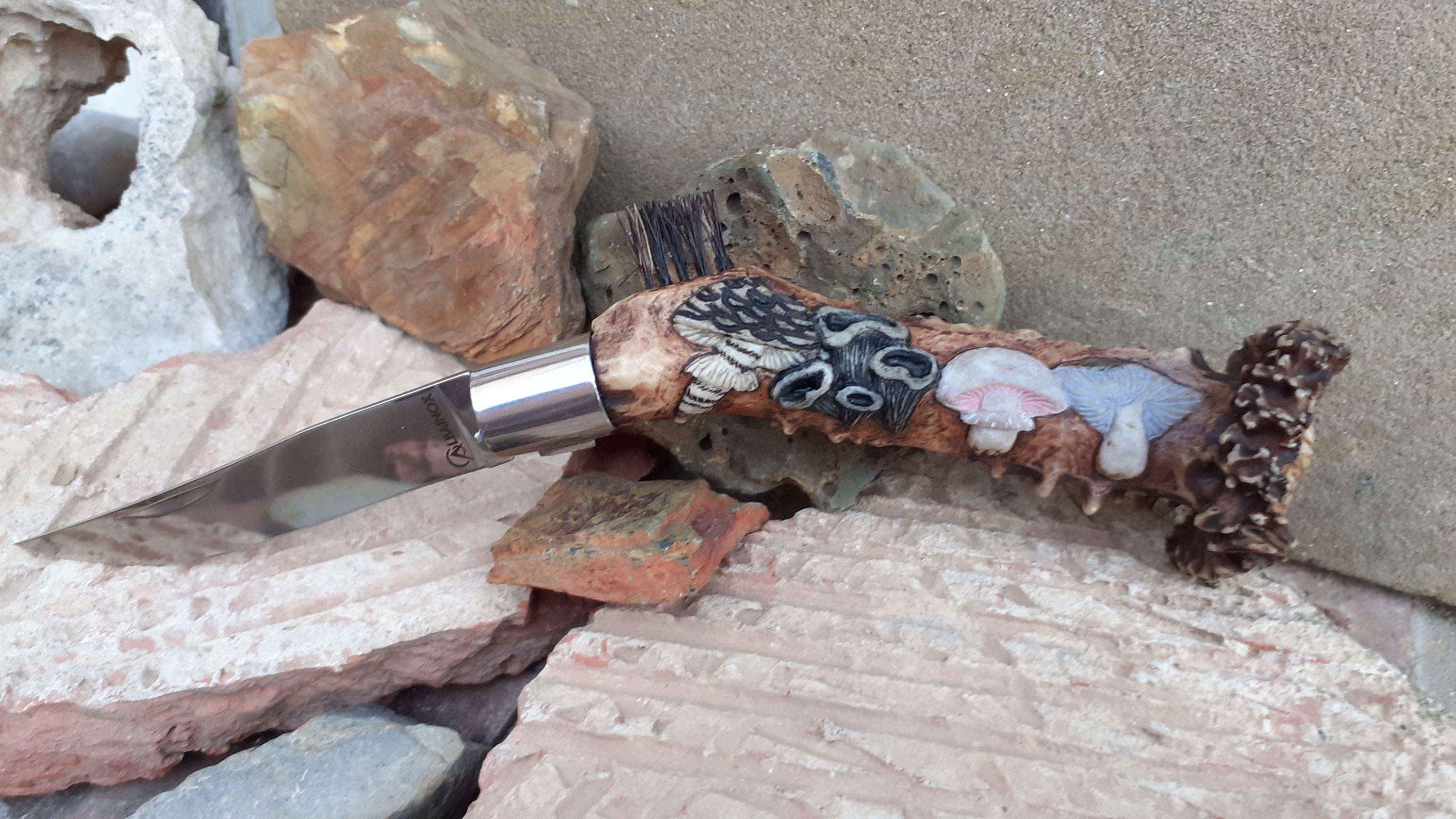 Navajas talladas en hueso, personalizadas con motivos micológicos y de naturaleza. Elaboradas a mano, en cuerna de corzo y ciervo, con filo de acero inoxidable. Productos de artesanía para regalos personalizados
