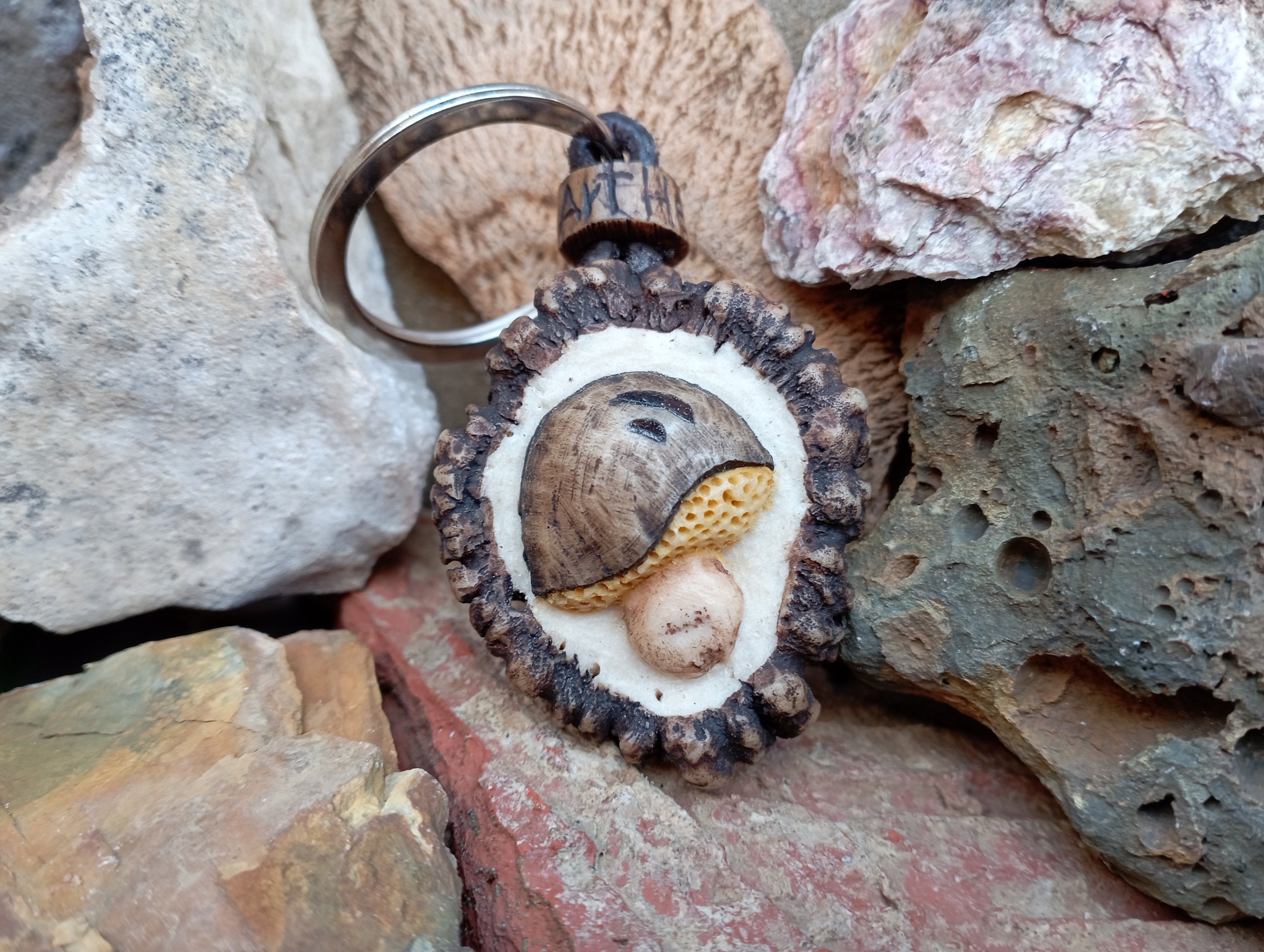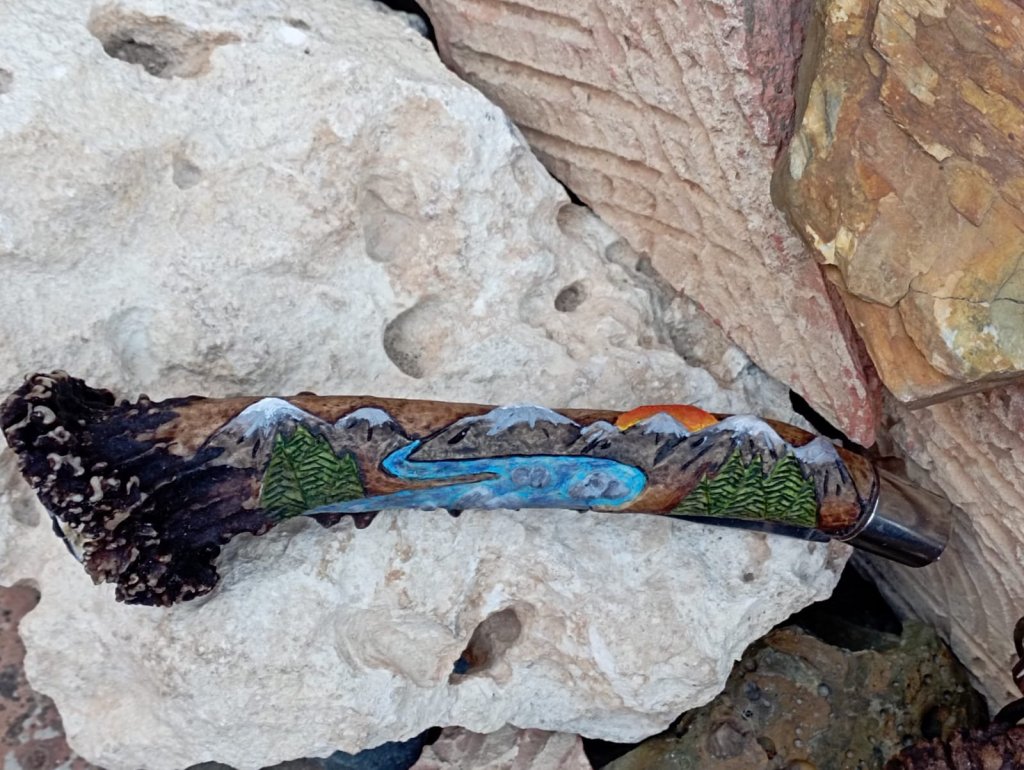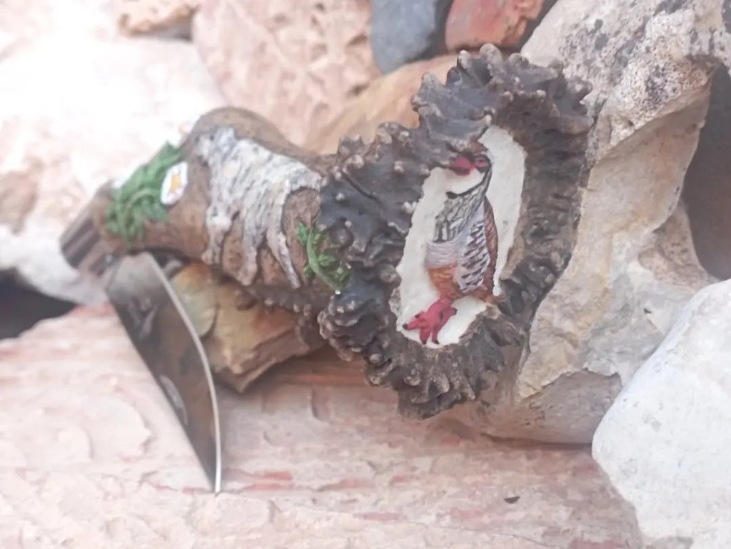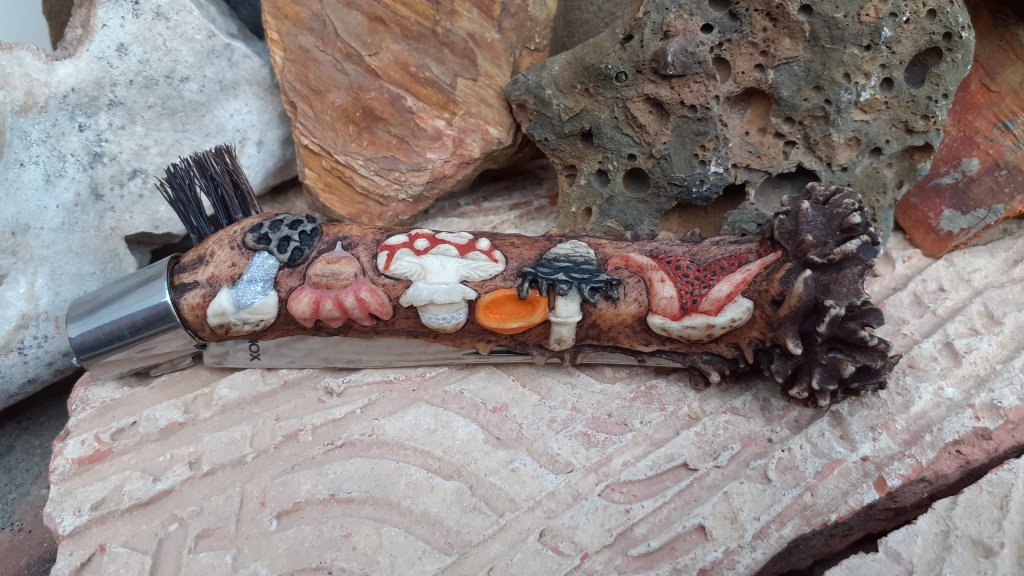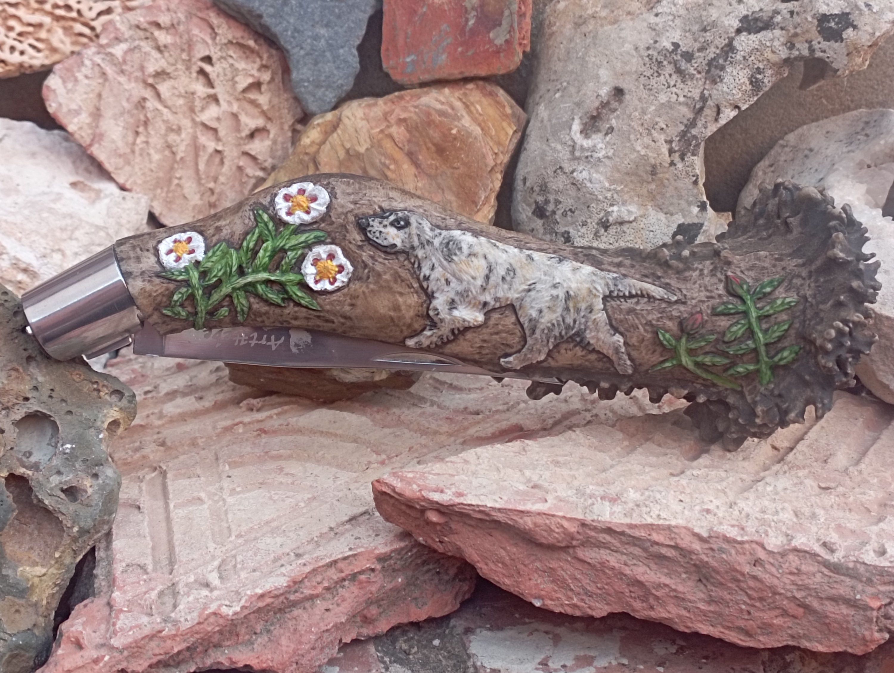 Navajas talladas en hueso, personalizadas con motivos micológicos y de naturaleza. Elaboradas a mano, en cuerna de corzo y ciervo, con filo de acero inoxidable. Productos de artesanía para regalos personalizados