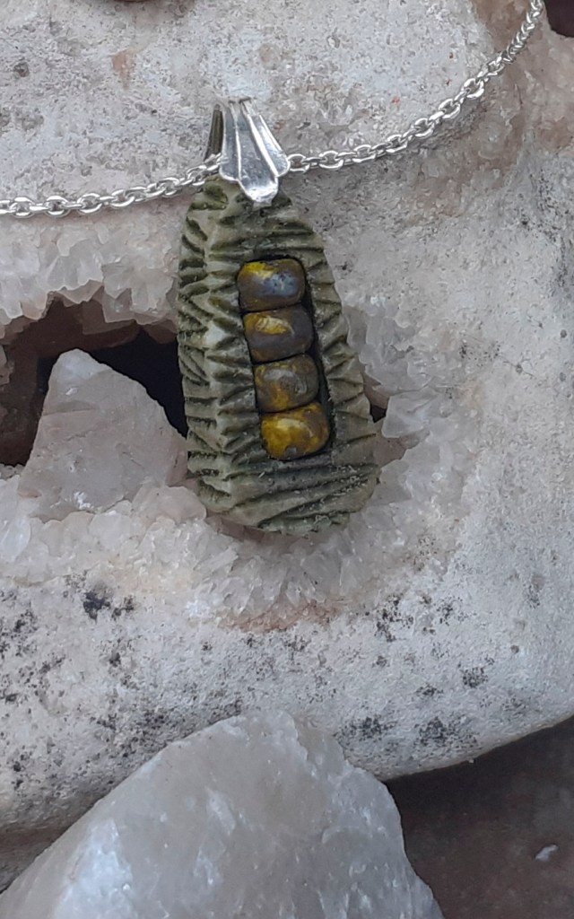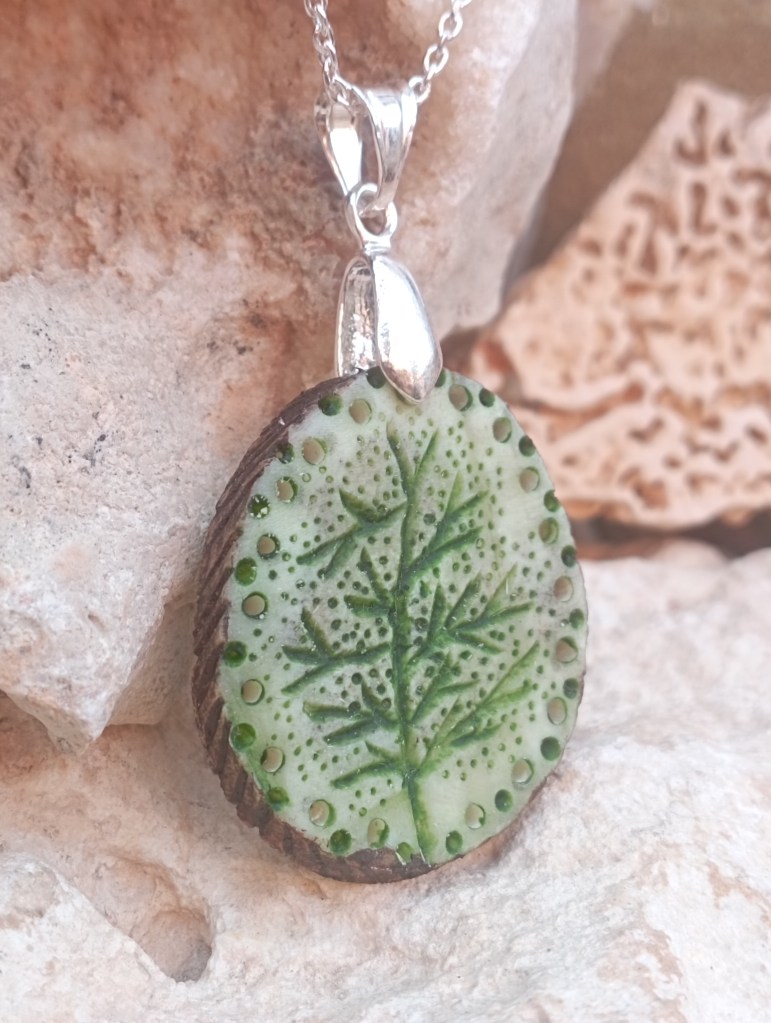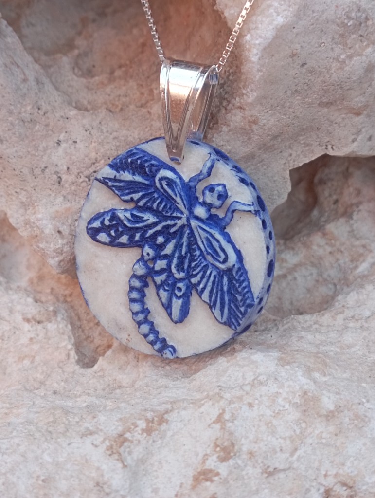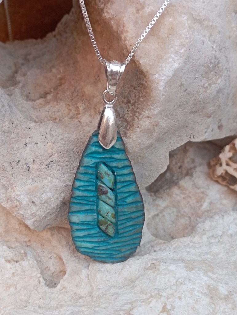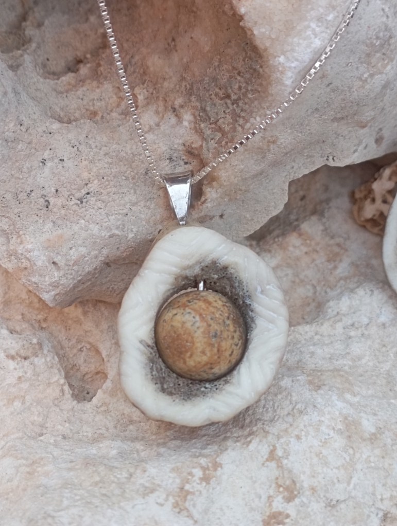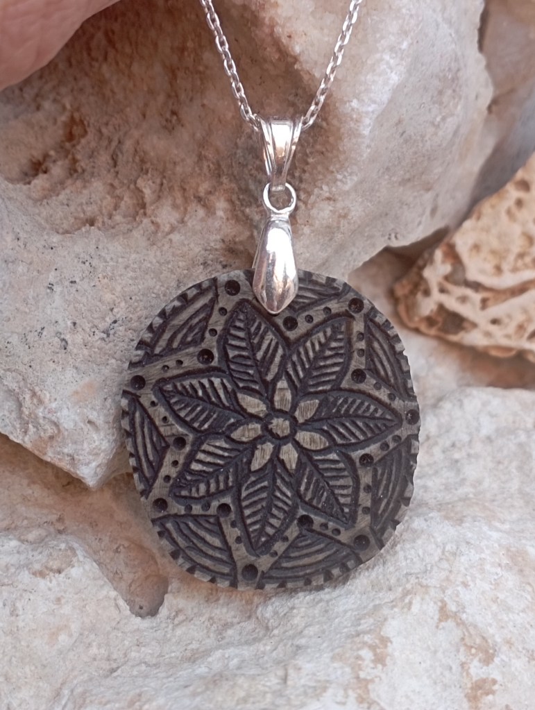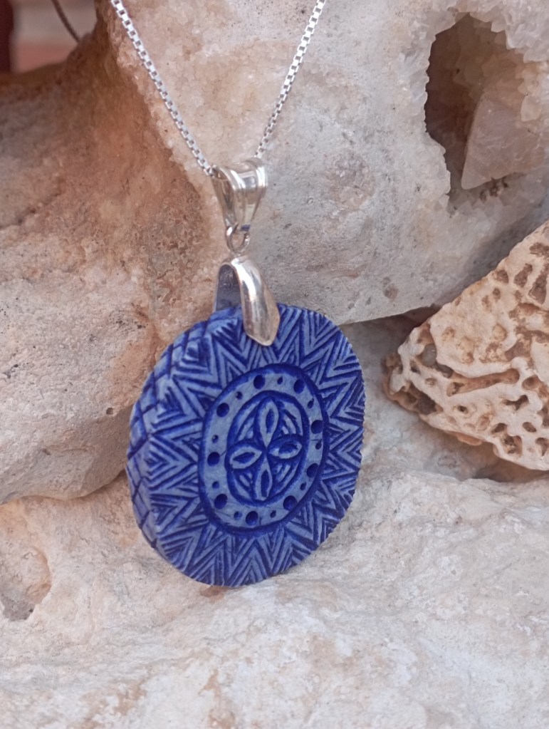 Colgantes artesanales, tallados en hueso, y con engarces de plata de ley.