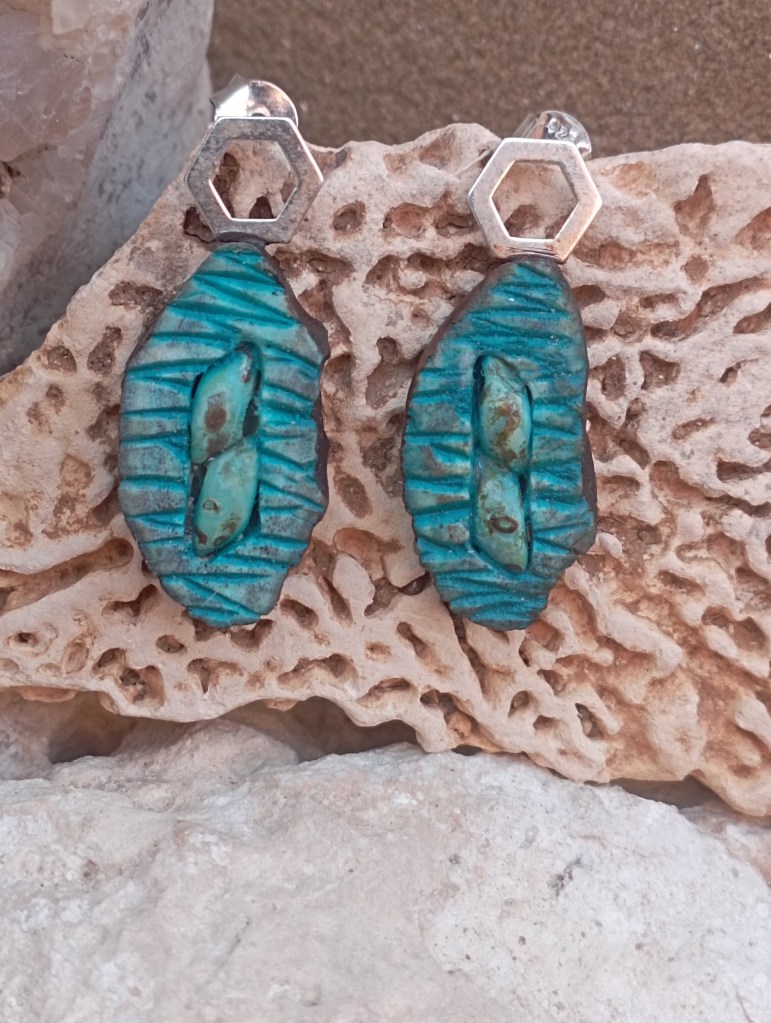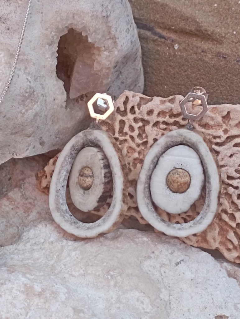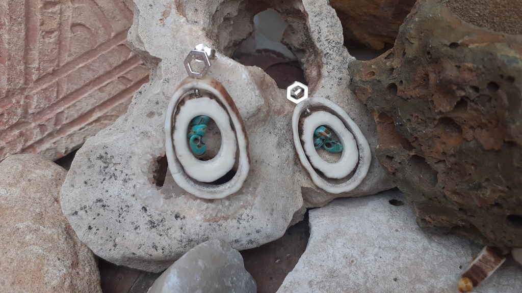 Pendientes artesanales, tallados en hueso, y con engarces de plata de ley.